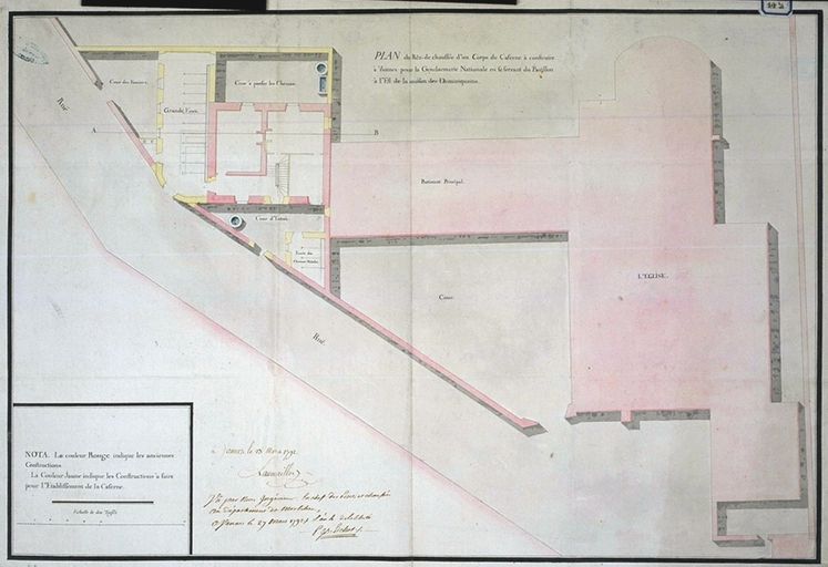 Plan du rez-de-chaussée d'un corps de caserne à construire pour la gendarmerie par Laumailler, 1792. AD Morbihan 1Fi 142/4.Immatriculation