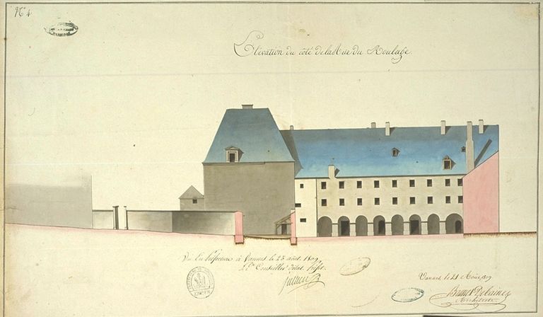 Caserne des jacobins servant de logement à l'armée impériale : élévation rue du Roulage, 1809 par Brunet-Debaines. AD Morbihan 1Fi 210/5.Immatriculation