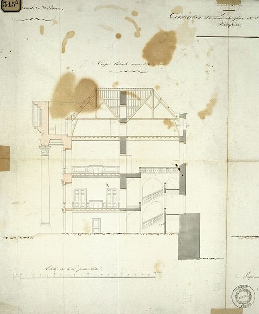 Construction du mur de face... Coupe latérale, par Charier, 1843. AD Morbihan1 Fi 315/3.Immatriculation