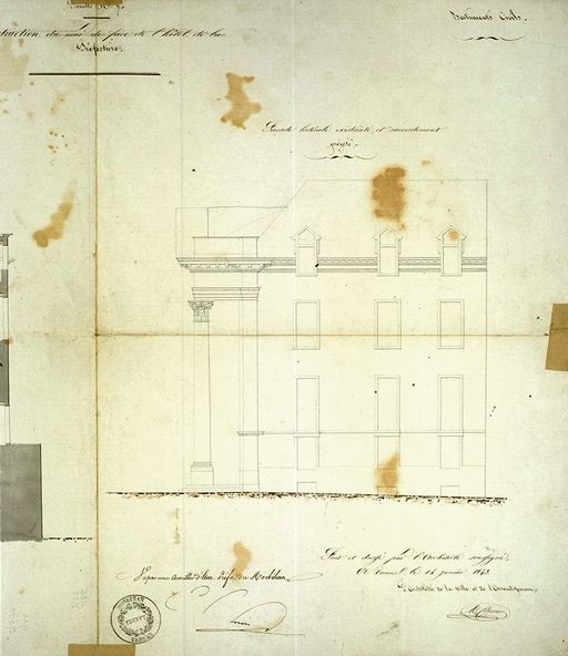 Construction du mur de face ...Façade existante, élévation par Charier, 1843. AD Morbihan 1 Fi 315/4.Immatriculation