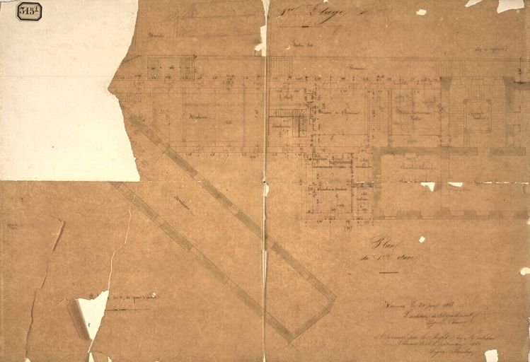 Projet de réparations à faire pour la restauration des archives de la préfecture, plan du 1er étage par Charier, 1855. AD Morbihan 1Fi 315/7.Immatriculation