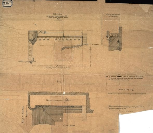 Plan, coupe, élévation de l'ancien mur de ville sur lequel s'appuie le bastion Notre-Dame, 1870. AD Morbihan 1Fi 315/18.Immatriculation