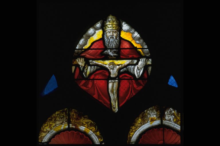 Verrière de la baie 3, tympan : La Trinité (état en 2001)Immatriculation