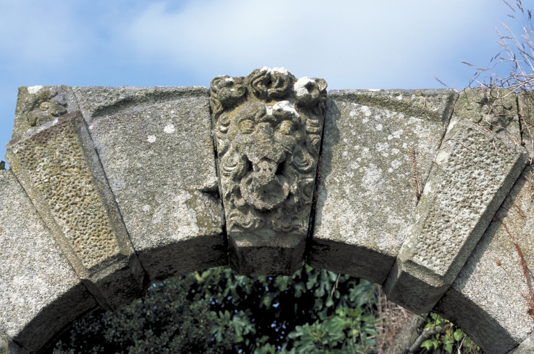 Portique d'accès à la cage d'escalier : détail, arcade droite : masque.Immatriculation