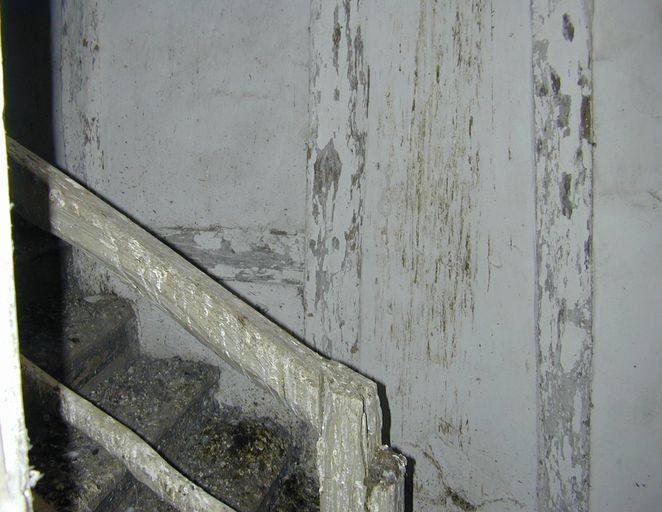 Corps postérieur en retour sur cour, corps d'escalier est, mur est en pan de bois et escalier.Immatriculation