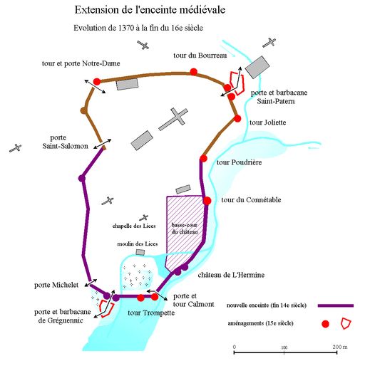 Extension de l'enceinte : évolution de 1370 à la fin du 16e siècle. Dessin Christophe Le Pennec.Immatriculation
