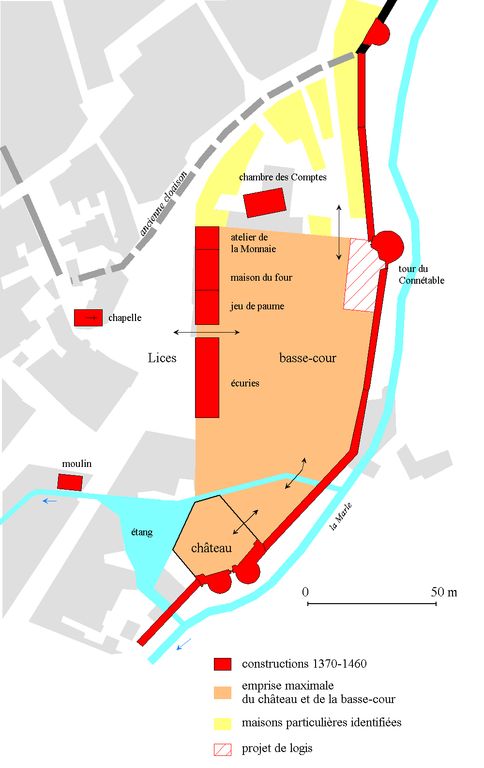 Les lices et la basse-cour du château de l'Hermine vers 1460. Dessin Christophe Le Pennec.Immatriculation