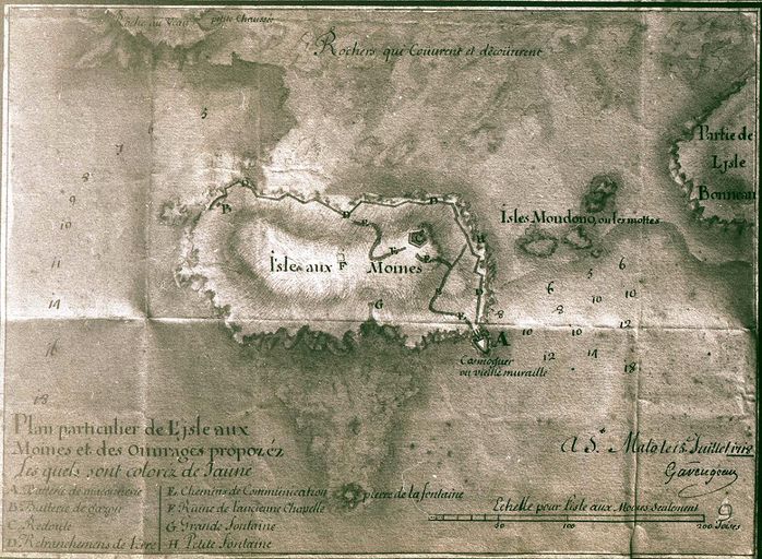 Plan du projet de batteries et redoute de l'île aux Moines par Garangeau daté du 15 juillet 1718Immatriculation