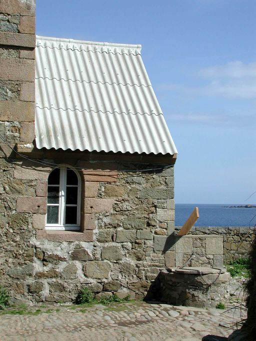 Vue de la chapelle et du puits de la caserne de l'île aux Moines. Contrairement aux apparences, la chapelle n'est pas adossée au pignon est, mais conçue comme un élément à part entière de la caserne.Immatriculation