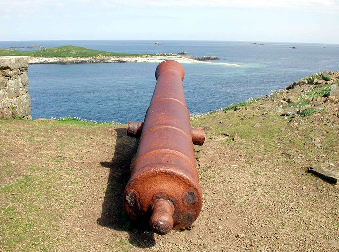 Perros-Guirec, fort de l'île aux Moines : vue de la pièce d'artillerie de la batterie de la Théroute. En arrière plan : l'île PlateImmatriculation