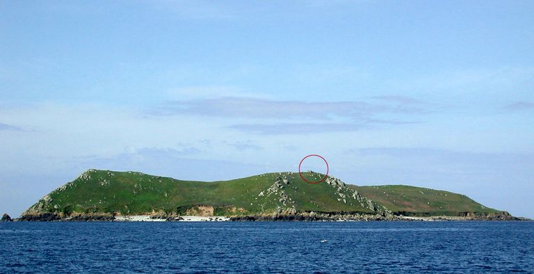Vue de l'île Bono et de son corps de garde (cercle rouge). Réserve naturelle, l'accès est interditImmatriculation