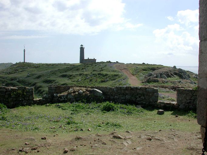 Vue de l'enceinte en redan protégeant la porte du fort depuis cette même porte. En arrière plan : le phare de l'île aux MoinesImmatriculation