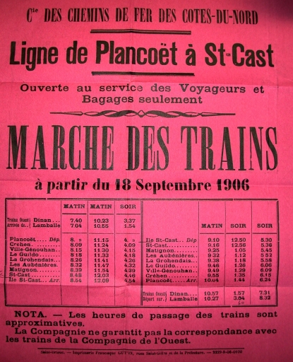 Annonce de la mise en service de la ligne Plancoët-Saint-Cast en 1906 (Coll. DDE, AD 22).Immatriculation