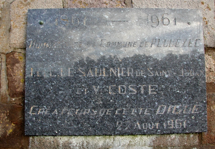 Vue : plaque hommage à J. et L. Le Saulnier de Saint-Jouan et V. Coste, créateur de la digue de Bréhec (1861).Immatriculation