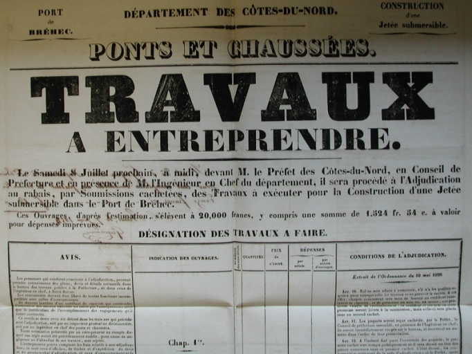 Affiche de l'adjudication de la 1ère jetée submersible de Bréhec (8 juillet 1854)Immatriculation