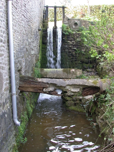 Détail du coursier et de la vanne motrice. Il subsiste les arbres des deux anciennes roues à augets.Immatriculation