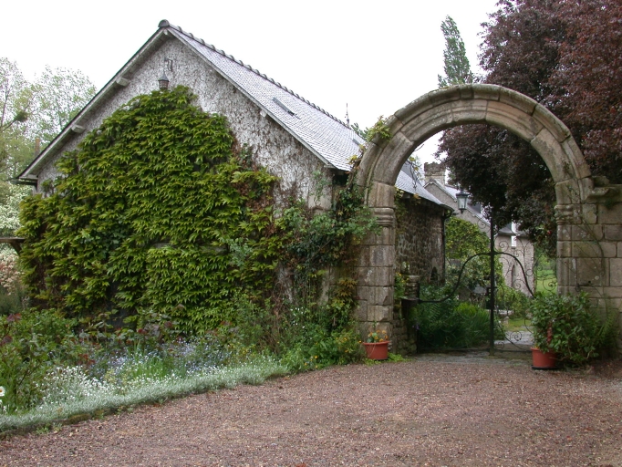 Vue générale nord de l'entrée du site du moulin : grange et portail provenant du manoir de Quingo à Brusvily.Immatriculation