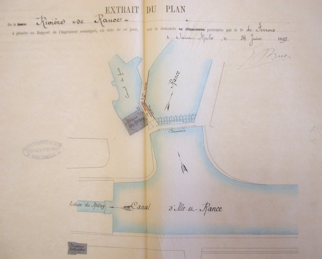 Plan de situation du moulin du Mottay dressé à l'occasion de la demande de reconstruction du mur du coursier (24 juin 1892).Immatriculation