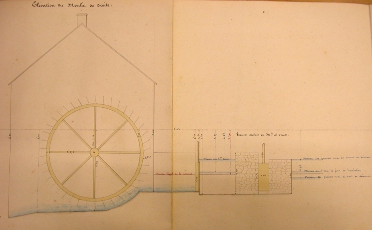 Elévations de la roue hydraulique du Moulin Neuf et de la vanne motrice (25 janvier 1859).Immatriculation