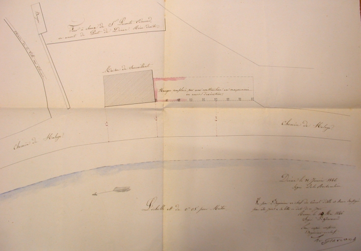 Plan du site des fours à chaux de la Ville aux Olliviers : recontruction en maçonnerie de l'ancien hangar en bois (21 janvier 1846).Immatriculation