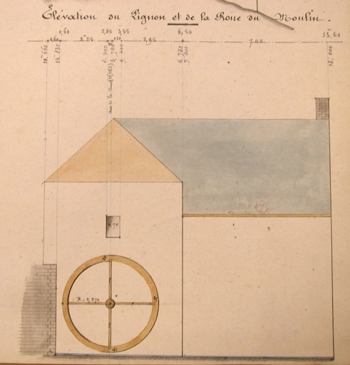 Elévation du pignon et de la roue hydraulique du moulin )28 `vril 1871).Immatriculation