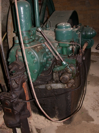 Détail du moteur : au premier plan se situe la préchambre de combustion, tandis que le cylindre comprenant le piston à tige est placé à l'arrière plan. Le système de graissage est positionné à droite du cliché.Immatriculation