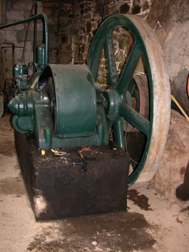 Vue générale du moteur. La courroie de transmission qu'actionnait le volant, à droite, a disparu.Immatriculation