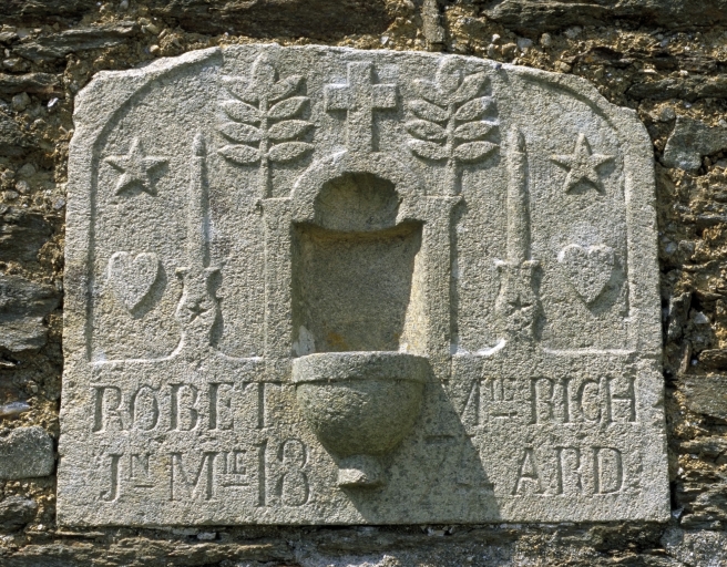 Kerlou. Grange, niche remployé gravée aux noms des commanditaires (1874)Immatriculation