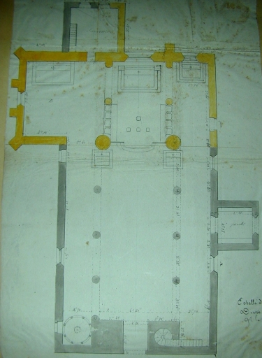 Clohars-Carnoët, église paroissiale Notre-Dame : plan au sol par Joseph Bigot, 1841. Etat avant transformation (A.E. Quimper, 8 L, fonds Bigot), reproduction de 2002Immatriculation