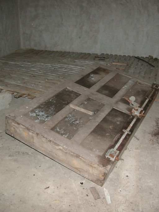 Vue d'une porte en bois stockée dans le bunker. Elle pourrait provenir de l'un des chambres froide des viviers...Immatriculation