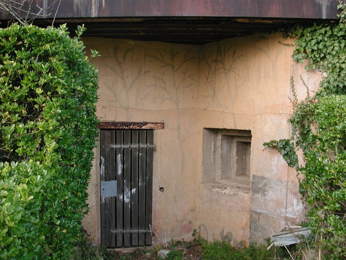 Vue de l'entrée (état en 2002). On peut voir les vestiges de la peinture de camouflage : plantes grimpantesImmatriculation
