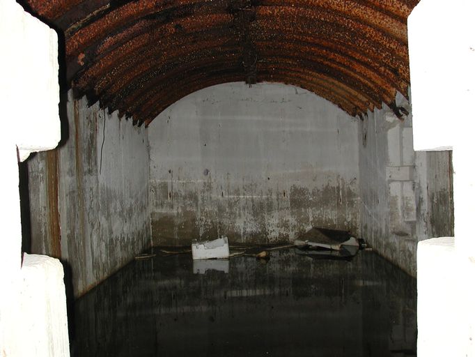 Vue de l'intérieur de l'abri type tôle métro (état en 2002). Le bunker est inondéImmatriculation