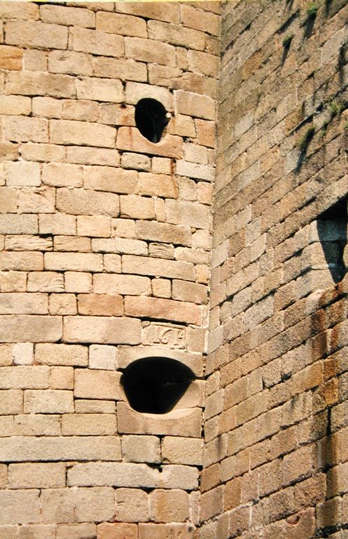 Vue du cartouche de la tour Française du château du Taureau indiquant la date de reconstruction de la tour : 1614 (état en 1999 avant la restauration)Immatriculation