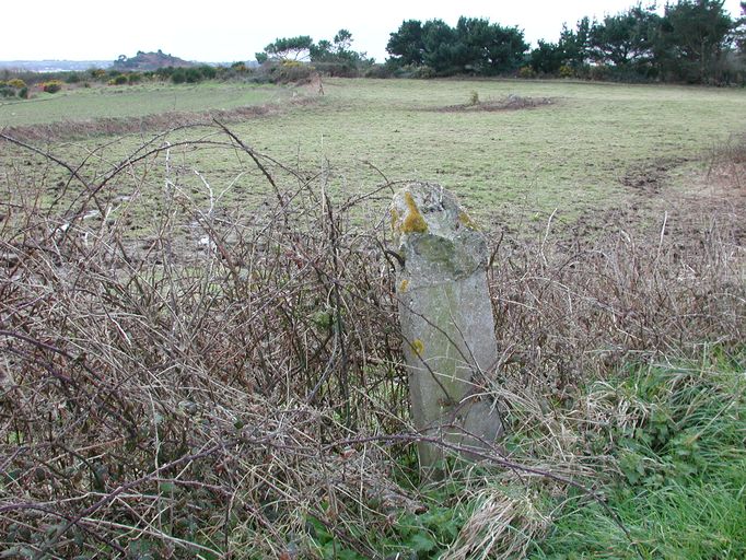 Vue générale d'une borne en béton délimitant les champs de mines de l'ensemble fortifié de la pointe Saint-SamsonImmatriculation