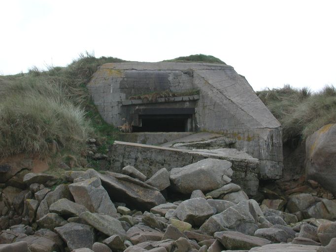 Vue de la casemate de type 680 depuis la plage Saint-Samson : embrasure et mur latéral de flanquement (état en 2002)Immatriculation