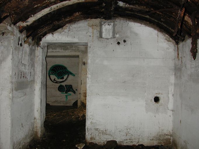 Vue intérieure (état en 2002). Il s'agit d'un abri type "tôle métro": porte donnant sur le couloir d'accès ; au centre en haut, niche murale (à lumière) et entrée/sortie de tuyau ; à gauche, peinture murale (numérotation)Immatriculation