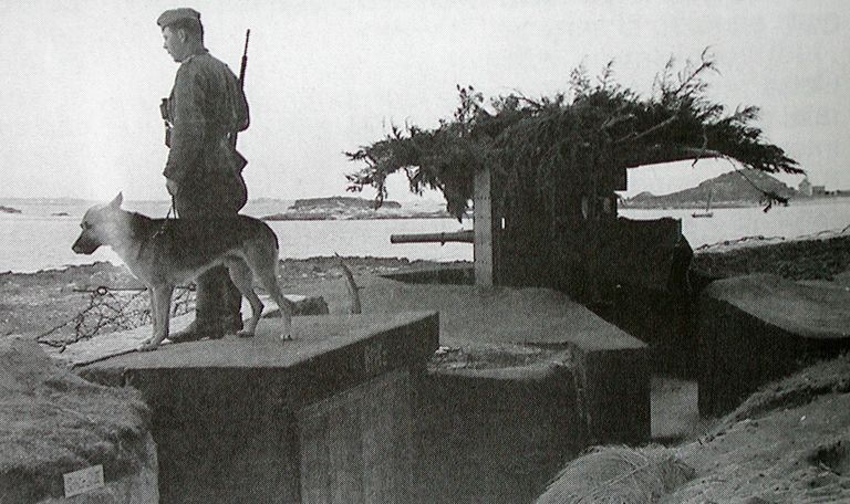 Vue d'un bunker - encuvement pour canon de 5 cm KwK (collection particulière). A gauche, en arrière-plan, on aperçoit la Passe aux Moutons et l'île Callot. ll s'agit d'une photographie de propagande : le soldat accompagné d'un berger allemand semble poser...Immatriculation