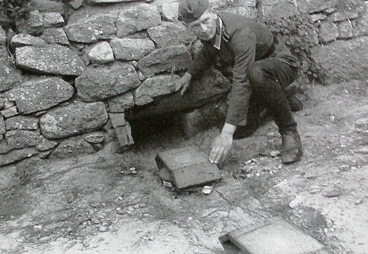 Vue d'un soldat en train de positionner un train de mines antichars pour défendre l'accès de l'ensemble fortifié du Port (collection particulière). Il s'agit d'une photographie de propagandeImmatriculation