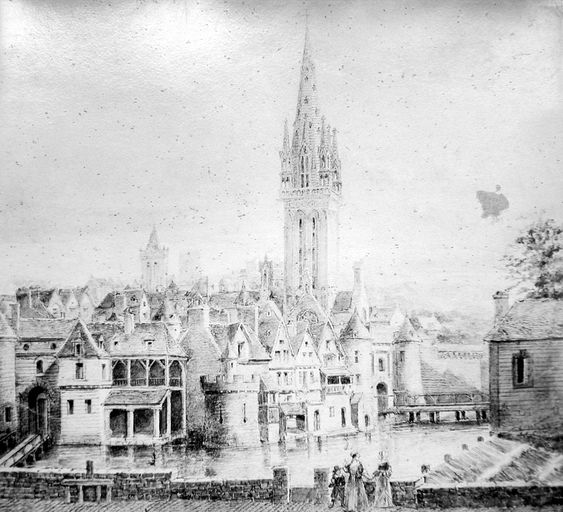Morlaix : vue panoramique d'une partie de la ville close vers 1640, pont et porte Notre-Dame, vestiges du château de Morlaix au sommet de la colline, sources non précisées, Bibliothèque Municipale de MorlaixImmatriculation