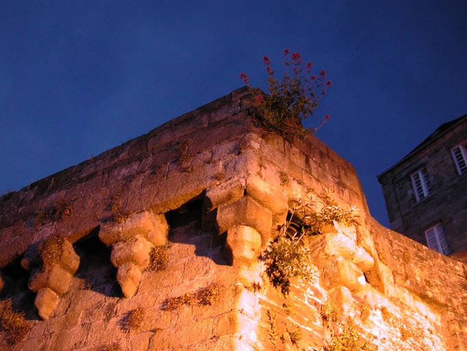 Vue de détail de l'angle du rempart (état en 2002). Il est couronné de mâchicoulis bretonsImmatriculation