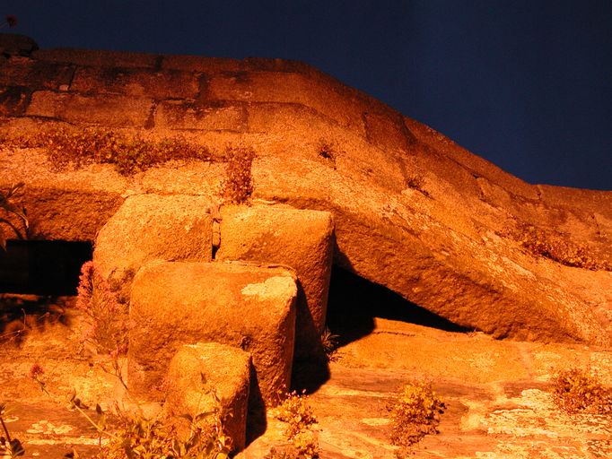 Vue de détail de l'angle du rempart (état en 2002). Il est couronné de mâchicoulis bretonsImmatriculation