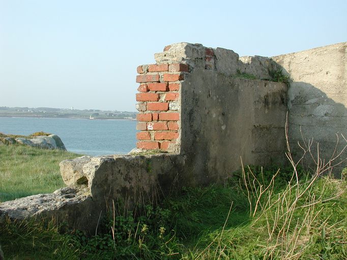 Vue de l'intérieur de la cuisine annexe du corps de garde de l'île de Sieck (moellons, briques, enduit, ciment, béton). Sur la langue de terre dans l'arrière plan à gauche se trouvait un canon mobile sur rouesImmatriculation