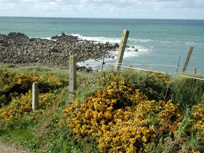 Vue des poteaux en béton servant à délimiter les champs de mines et les barbelés de l'ensemble fortifié de Tévenn BrazImmatriculation