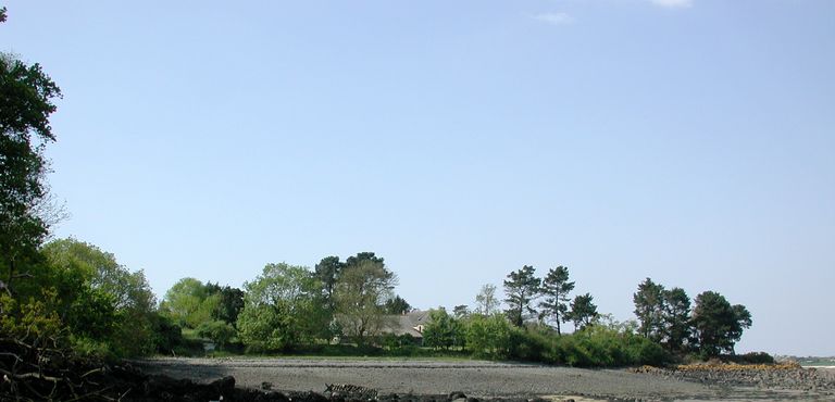Vue générale de l'ensemble fortifié de Perrohen depuis l'anse de Térénez, de ce côté, les arbres ont été épargnés par la tempêteImmatriculation