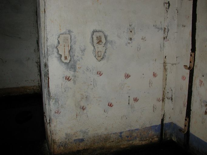 Vue de la peinture murale de la pièce de vie - chambre de troupe : fleurs au pétale rouge et frise basse de couleur bleue (état en 2002). A droite, crochets de fixation des couchettes tubulairesImmatriculation
