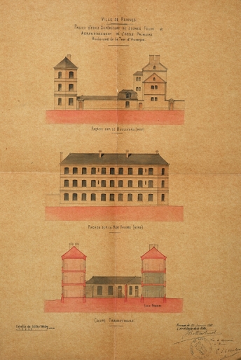 Façade sur le boulevard. Façade sur la rue Thiers. Coupe transversale, dessin, par Jean-Baptiste Martenot, 1886 (A. C. Rennes)Immatriculation