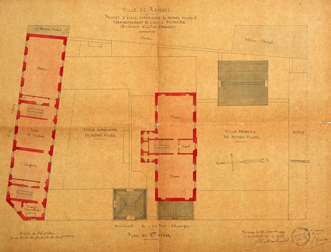 Plan du deuxième étage, dessin, par Jean-Baptiste Martenot, 1886 (A. C. Rennes)Immatriculation