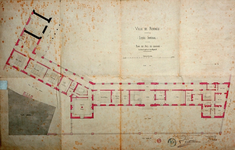 Bâtiment projeté sur le cours Napoléon III. Plan du rez-de-chaussée, 1859 (A. C. Rennes)Immatriculation