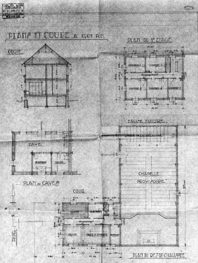 Presbytère et chapelle provisoire. Plans et coupe, 1932 (A. C. Rennes)Immatriculation