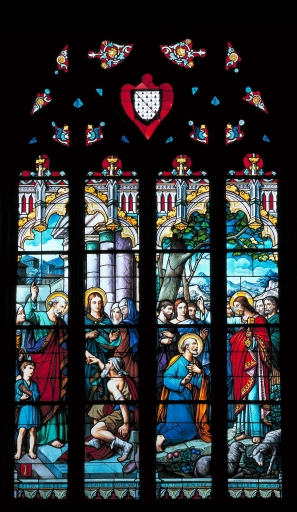 Verrière à personnages de la baie 0 : Don des clés, saint Pierre guérit un paralytique (Saint-Pierre-de-Plesguen fusionnée en Mesnil-Roc'h en 2019),